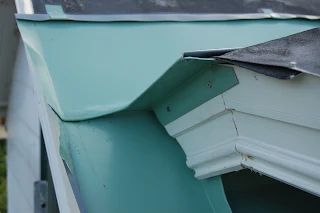 Snickarna sätter av oförklarlig anledning upp vindskivorna på tornet med olika avslut mot taket. För säkerhets skull gör vi om det själva.